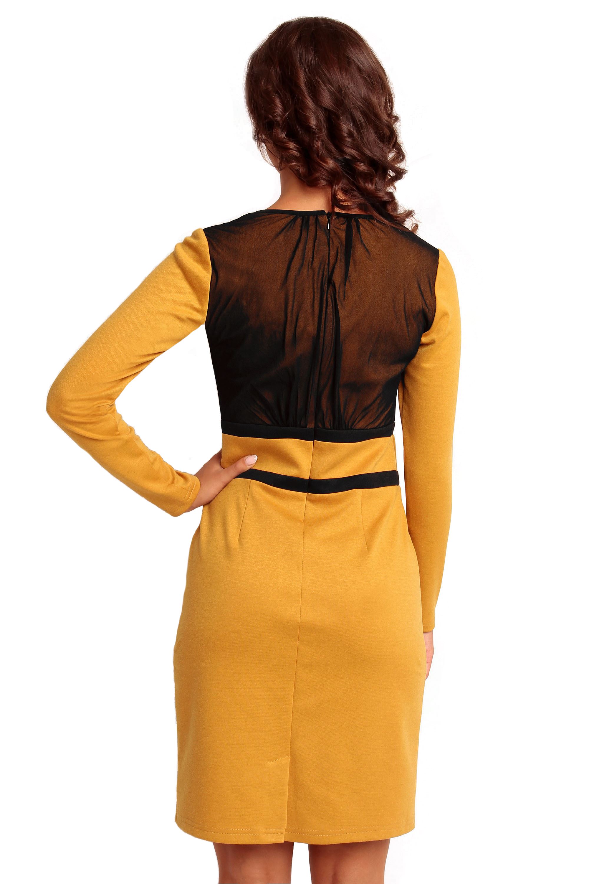 Formal dress made of nice-to-touch fabric, pencil cut, top covered with translucent tulle, an inset in a contrasting color at the waist. On the back zip fastener.